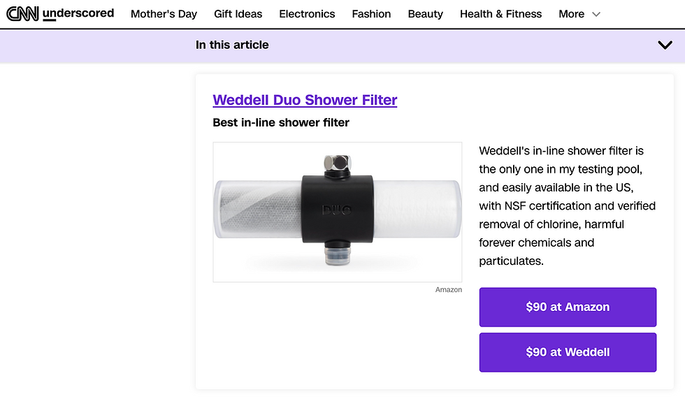 Weddell Water was featured in CNN Underscored’s, “I Tested 11 Shower Filters Over the Past Year — These 3 Are the Very Best Value,” a rigorously tested roundup of top-performing shower filters. Highlighted for its in-line shower filter, the brand stood out as the only option in the testing pool widely available in the U.S. with NSF certification, along with verified removal of chlorine, harmful “forever chemicals” (PFAS), and particulates. Positioned among the top-value picks, Weddell Water earned recognition for its high-performance filtration and trusted, third-party–verified results. See it here.
